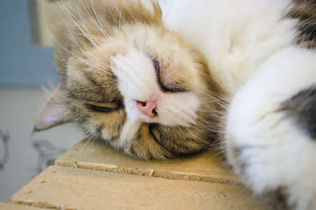 Sleeping cat on wood box.