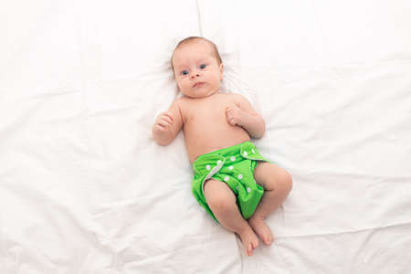 Reusable diaper on the baby copy space . An article about reusable diapers. Saving on diapers. Concern for the environment. Eco-products. Breathable diapers with buttons. High quality photo