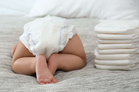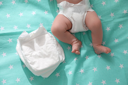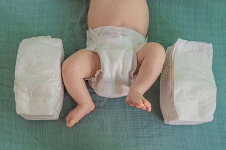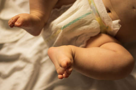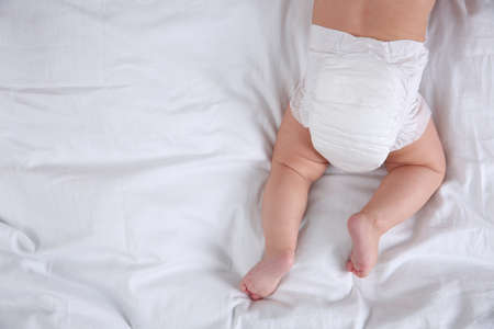 Newborn baby belly and legs in diaper, lying on white bed, top view, copy space. Newborn