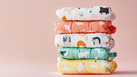 A colorful stack of baby diapers featuring playful animal patterns against a soft beige background, ideal for parenthood, nursery decor, and baby care essentials.