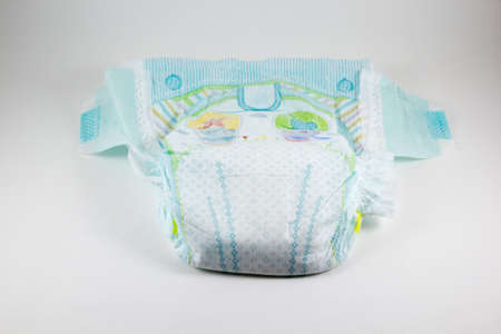 Baby diaper on a blue background. with copy space. Hygiene and child care.