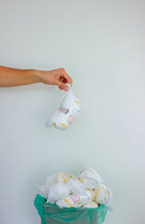 Hand used throwing diaper into trash bin, concept of hygiene and waste disposal.