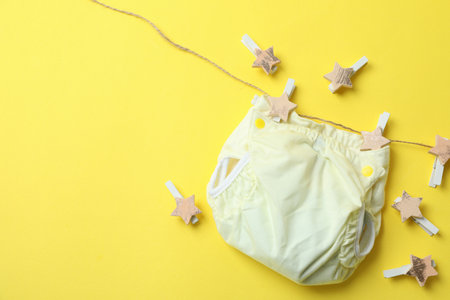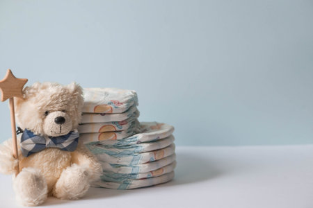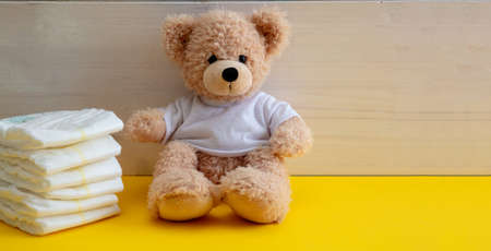 Baby diapers stack and cute teddy bear sitting on yellow color floor, wooden wall background, banner, copy space. Newborn nappies concept