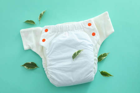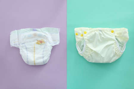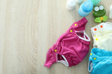 Reusable colorful diapers and baby wearing reusable diapers flatlay. Eco trend, caring about nature lifestyle, responsible consumption concept