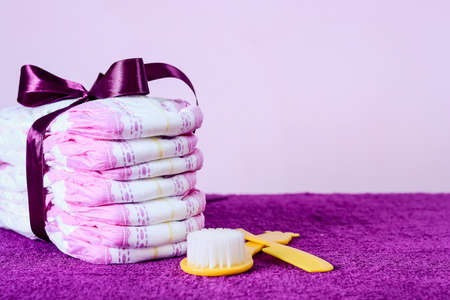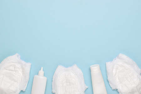 Diapers and hygiene products. Background with children's body care accessories. Flat layout, top view, a place to copy.