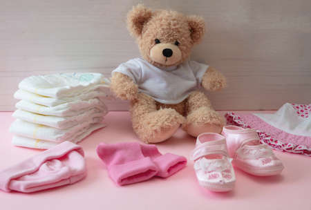 Baby girl accesories. Cute teddy bear sitting on pink color floor, wooden wall background. Newborn girl supplies, diapers, shoes, clothing
