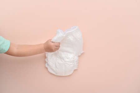 A child's hand is pulling a diaper-panties on a beige background. Pesto for the text. copy space.