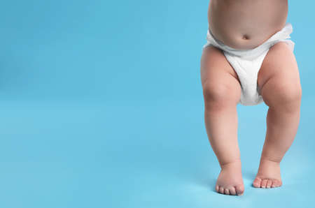 Cute baby in dry soft diaper standing on light blue background, closeup. Space for text