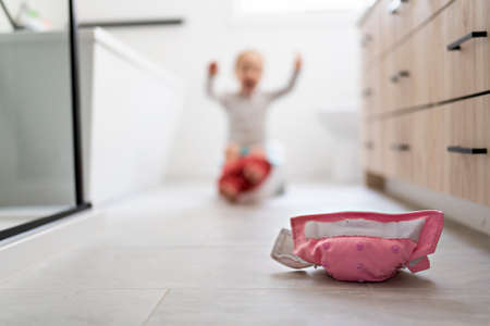 Adorable young baby child sitting and learning how to use the toilet with focus diaper in the front