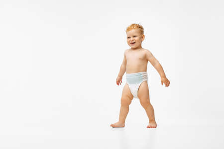 Full-length portrait of little boy, child in diaper in motion, walking isolated over white background