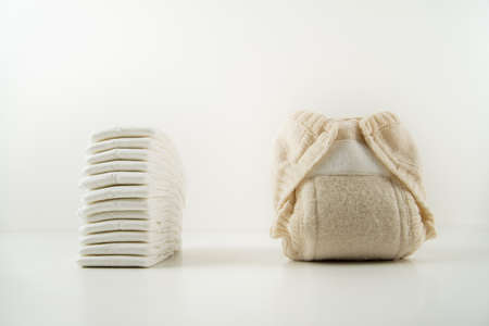 Reusable diapers in the copy space stack . An article about reusable diapers. Saving on diapers. concern for the environment. Eco products. Breathable diapers with buttons.