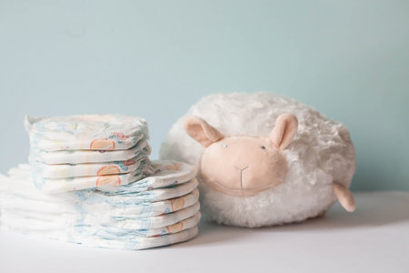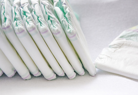 Group of disposable diapers arranged over a white changing table. Hygiene and health care for baby
