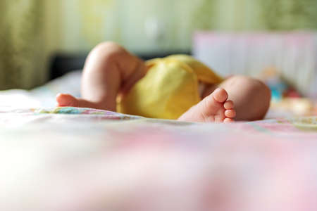 The legs of a newborn baby. Baby pink baby legs that learn to crawl in a crib with a white sheet. a tiny unrecognizable girl moves in a crib. Defocused