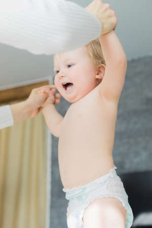 A mother woman puts on a diaper for a baby boy. Mom dresses a happy child in clothes on the bed.