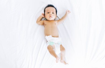 Top view of cute baby in dry soft diaper on white bed. Space for text