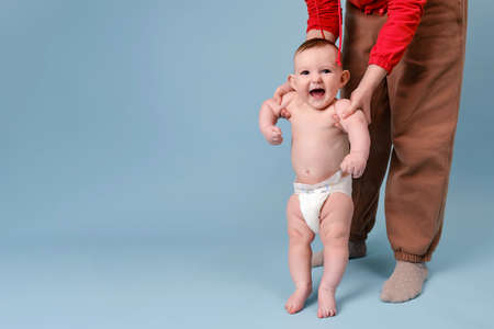 Mother teaches the child to stand on his feet and walk, baby boy on a studio blue background