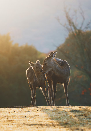 Sika deer live freely in a Japanese Nara Park. A young wild Cervus nippon during spring season. Tourist attraction of Japan. Natural parks of the world.