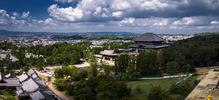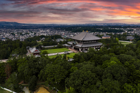 Aerial view of Todai ji Daibutsuden and Nara Park in summer light