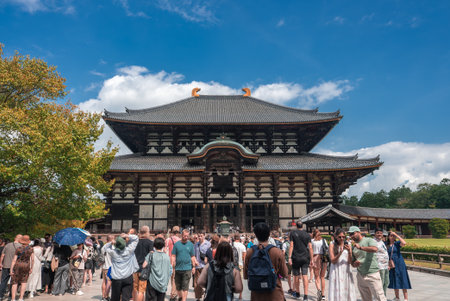 Tourists gather at Todai ji Daibutsuden in Nara on a bright summer day