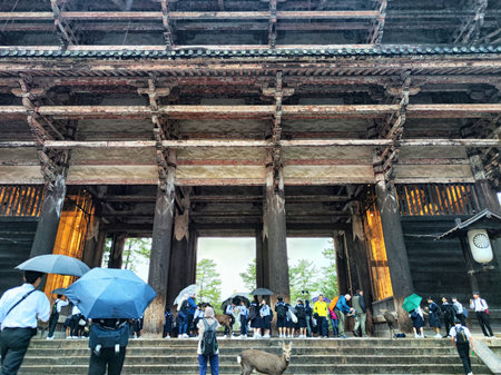 Japan, Nara - October 29, 2024: School students gather under umbrellas at Todai-ji temple in Nara, Japan while a deer roams nearby on a rainy day.