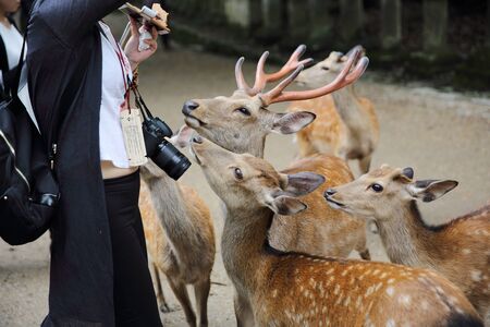 Nara, Japan - July 26, 2017: Unidentified people feeding a wild deer in Nara, Japan. Nara is a major tourism destination in Japan