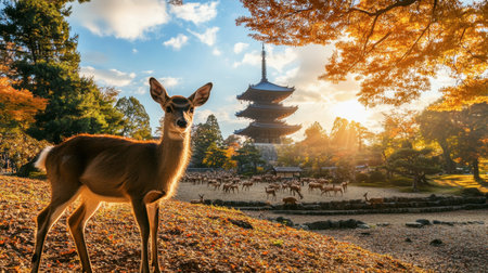 The historic temples of Nara, with deer roaming freely in the park, surrounded by beautiful autumn leaves.