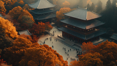 An aerial view of majestic temples surrounded by vibrant autumn foliage, showcasing rich colors and creating a peaceful atmosphere for visitors.