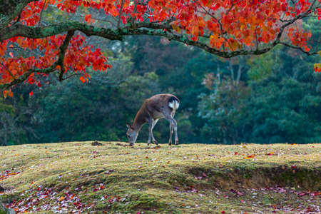 Deer standing background red leaves autumn tree at the park in Nara, Japan. The park is home to hundreds of freely roaming deer.
