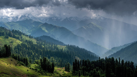 Kashmir beauty green hills forests in mountains. summer landscape with green grass on the hills. nature scenery on a sunny day with clouds on the sky