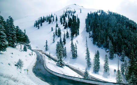 Clouds embracing a mountain peak over highway of Zojila Pass, a high mountain pass between Srinagar and Leh at 11575 ft, 9 Km stretch. Highest Indian National Highway.