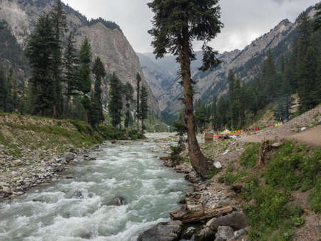 Majestic Jhelum River, a tributary of Indus River, passes through Kashmir Valley bounded by the Great Himalayas and Pir Panjal Range. Jammu and Kashmir, India. Nature Landscape background scenery.