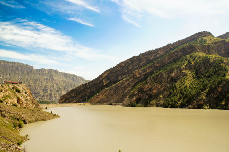Mountain River in Gilgit Baltistan Highlands under the Blue and Cloudy Sky, Pakistan