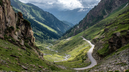 Discover a breathtaking view of a winding road nestled in a vibrant green valley, framed by dramatic mountains and cloudy skies, perfect for nature lovers and adventurers.