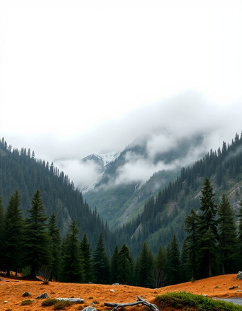 A serene mountain landscape showcasing rolling hills and dense evergreen forests enveloped in soft mist, creating an atmosphere of tranquility and natural beauty.