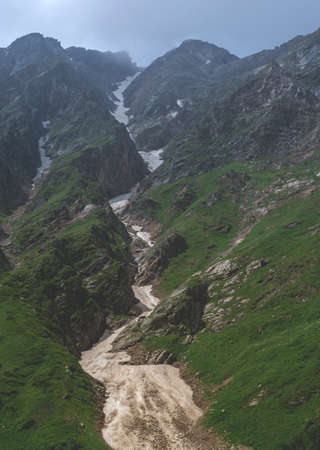 Snow melts in the mountains and flows down to the plain. Melting glacier global warming climate change.