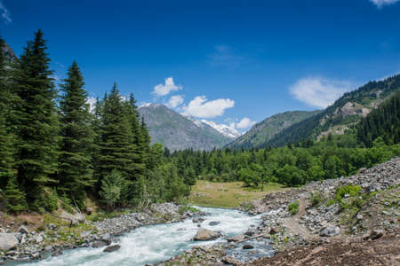 Fast River and Green Mountain Forest under the Blue Sky in Gilgit Baltistan Highlands, Pakistan