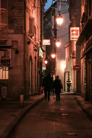 TOULON, FRANCE - NOVEMBER 10, 2017: Narrow Street of Toulon Vieille Ville district, the old town in the city center, at night, in a dilapidated dark condition, with mediterranean buildings