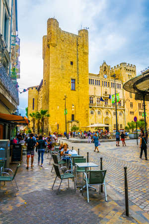 Restaurant in front of Town hall square. Narbonne. Pedestrian shopping street in old city central Narbonne. South of France.