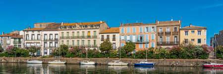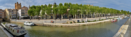 Narbonne, France, May 4, 2016 Panorama of Robine canal in historical center of Narbonne City, Languedoc-Roussillon France