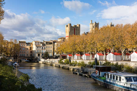 Narbonne, France - October 30, 2016 Robine Channel in Narbonne as seen from the quay in direction of historical city center.