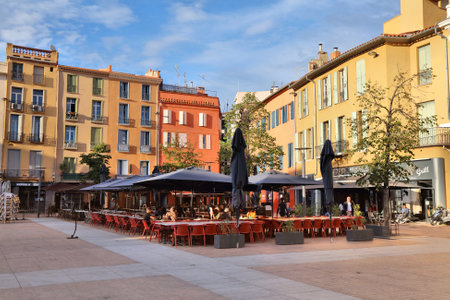 PERPIGNAN, FRANCE - OCTOBER 4, 2021: People visit main square Place de la Republique in the prefecture town of Perpignan in Southern France.