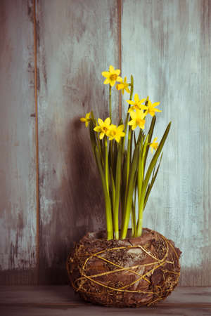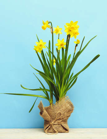 Composition of beautiful daffodils planted in a flower pot on a blue background.