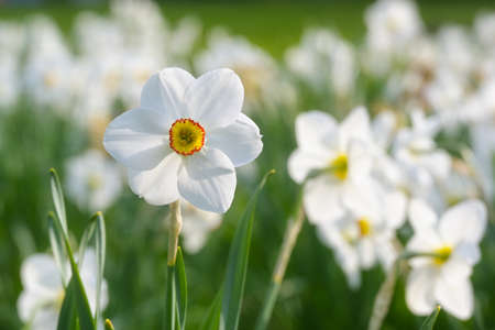 Blossom of poets daffodil (Narcissus poeticus) with white petals and a yellow red ring growing in a blooming flower bed in the meadow, copy space, selected focus, narrow depth of field