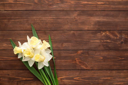 Fresh cutted yellow blooming daffodils on beige background, 8 March, Women's, mother's Day, Easter concept banner