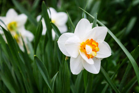 Closeup white daffodil flower Cupped Daffodil Carlton six petals yellow orange trumpet-shape central corona. The delicate bright rich Beautiful Narcissus poeticus Tazetta garden sun garden