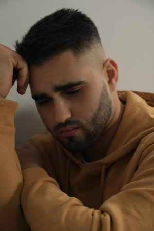 Sad depressed anxiety Asian man thinking contemplating bad thing happened in his life, stress exhausted feeling down expression, financial or relationship problem concept