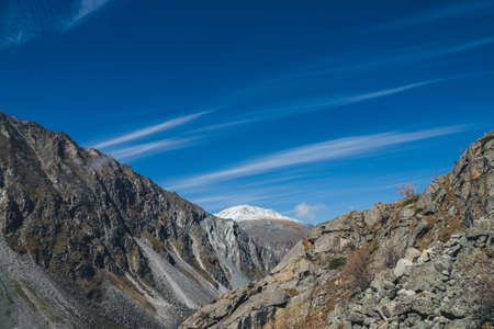 Colorful alpine landscape with great mountain in autumn colors with snow on peak under cirrus clouds in blue sky. Awesome autumn scenery with rocks and snow-covered mountain top. Scenic mountain view.