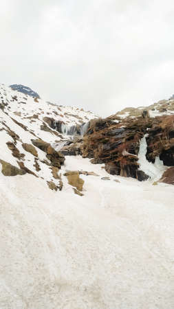 Awesome view from landscape with snow to high snowy mountain range in overcast. Atmospheric scenery with snow mountains under cloudy sky