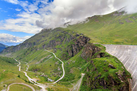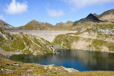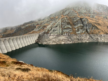 The dam Lucendro or concrete dam on the reservoir lake Lago di Lucendro in the Swiss alpine area of the St. Gotthard Pass (Gotthardpass), Airolo - Canton of Ticino (Tessin)
