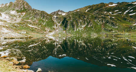 Mountain landscape of a calm idyllic place of nature, a paradise view with a lake and alpine meadows. The concept of travel, hiking and adventure.